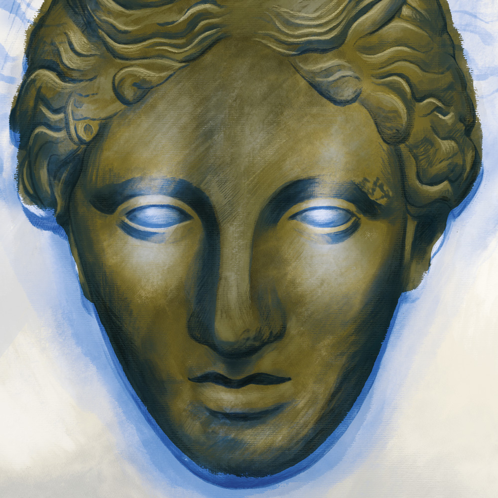 Illustration pour une couverture de la nouvelle fantastique de Prosper Mérimée (1837). Une mystérieuse statue antique fascine et inquiète tout un village…